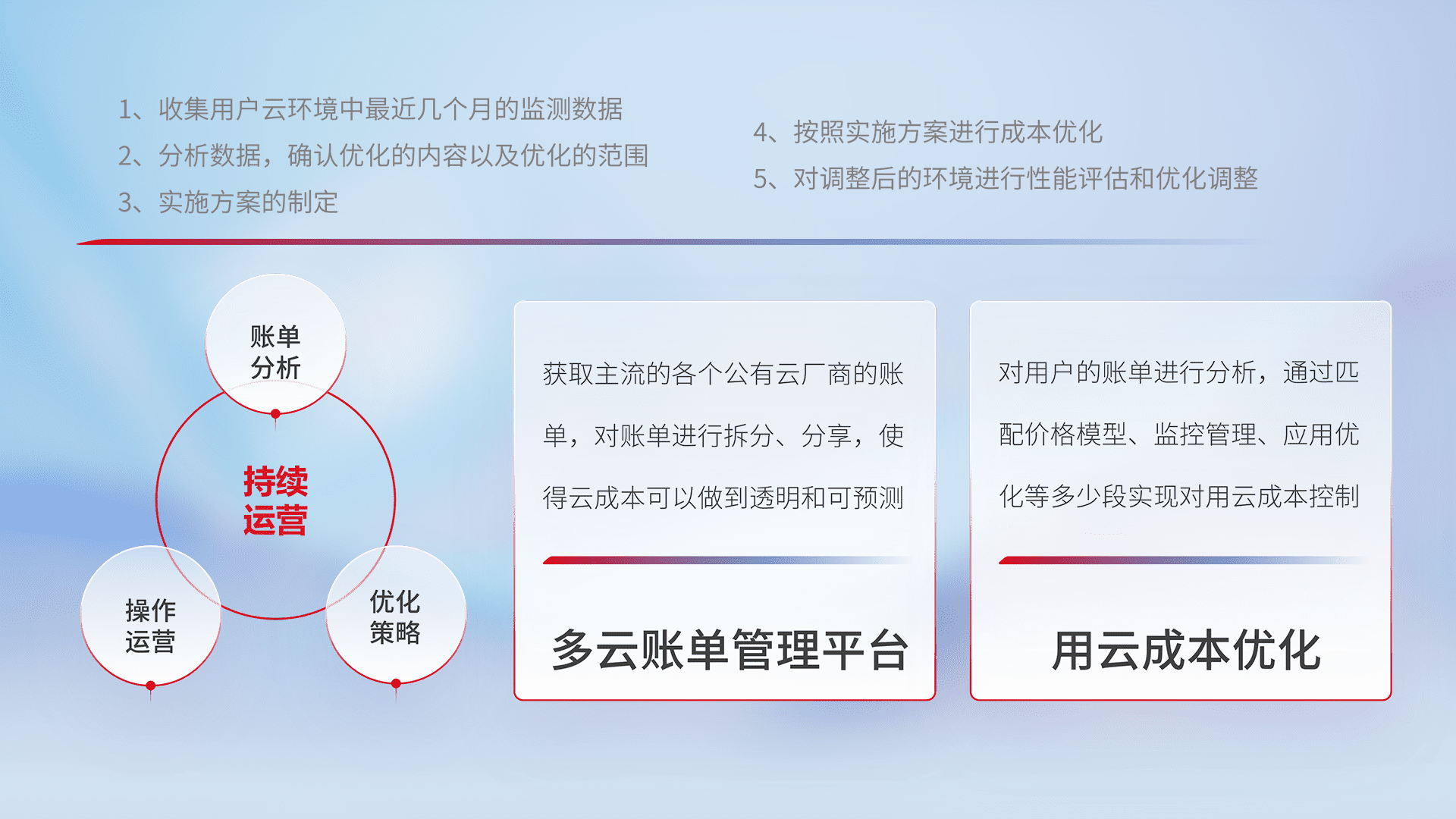 通过多云纳管,,,以统一的资源数据模型把客户的云资源进行抽象和封装,,,,进而实现对多云资源的统一操作,,保障云资源管理的可靠性、、、稳定性与可用性。。。。量身定制化运维内容,,,配置、、、开发运维、、补丁管理、、备份、、监控、、、、认证和访问管理、、、、审计和日常巡检等,,,保障在用云过程中的可靠度,,,,稳定度以及高可用率。。